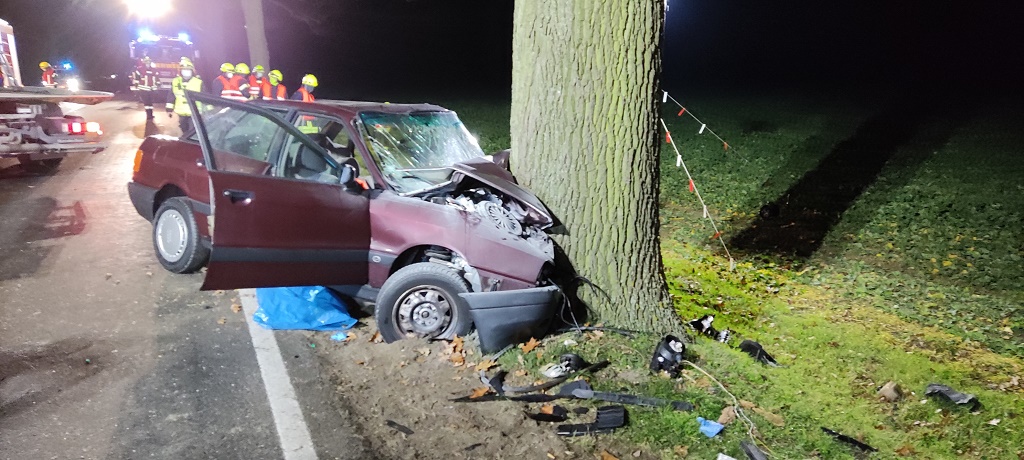 Havelland - aufgrund eines Unfalls mit einer schwerverletzten Person musste heute am späten Nachmittag die Bundesstraße 5 zwischen den Abzweigen Haage und Senzke in der Gemeinde Mühlenberge eine Zeitlang komplett gesperrt werden. Ein Rettungshubschrauber kam zum Einsatz, um die Rettungskräfte zu unterstützen. Aus bislang noch unbekannter Ursache war der Audi von der Fahrbahn abgekommen und fuhr anschließend frontal gegen einen Baum. Einsatzkräfet der Feuerwehr des Amtes Friesack mussten mit schwerem gerät ran um den Fahrzeugführer aus dem völlig zerstörten wagen befreien zu können. Der Fahrzeugführer erlitt hierbei schwere Verletzungen, der Hubschrauber (DRF) brachte ihn in ein Krankenhaus.