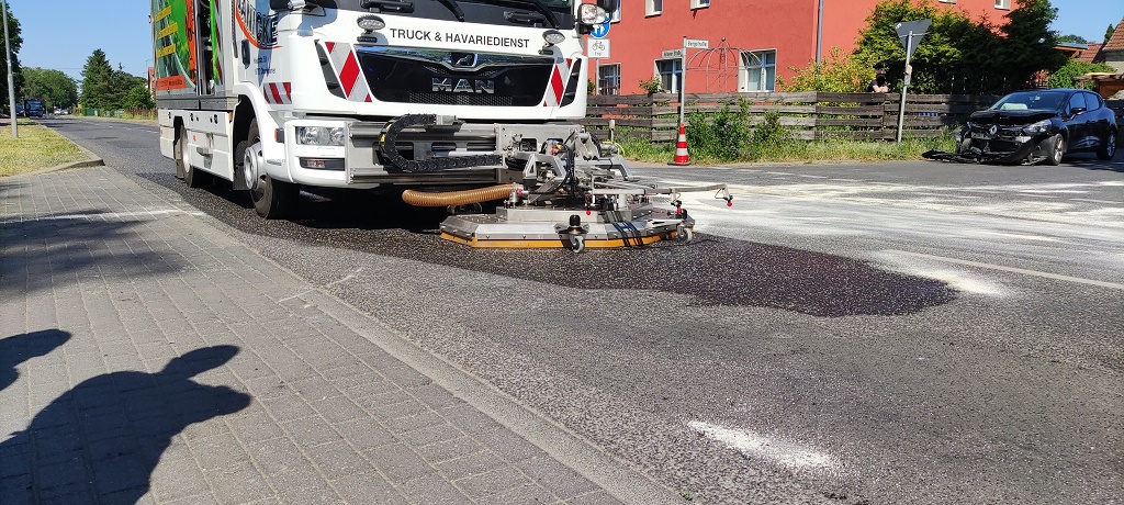 Aufgrund der ausgelaufenen Flüssigkeiten auf der gesamten Fahrbahn kam eine Spezilfirma mit Reinigungsmaschine zum Einsatz. An beiden Unfallfahrzeugen ein Renault Clio sowie ein Mercedes entstand wirtschaftlicher Totalschaden.