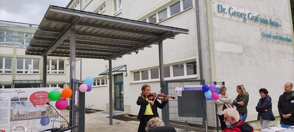 Neben der Schlüsselübergabe standen noch viele weitere Highlights auf dem Programm am Tag der Städtebauförderung. Ein buntes Programm sorgte für einen informativen und unterhaltsamen Nachmittag für Groß und Klein im Quartier „Innenstadt Ost“ in Nauen. Die Beauftragte für Bürgerbeteiligung und ehrenamtliches Engagement BBeE veranstaltete gemeinsam mit dem Quartiersmanagement der Innenstadt-Ost in Trägerschaft des Mikado e.V. und zahlreichen weiteren Kooperationspartnern den schon für Mai 2021 geplanten Tag der Städtebauförderung. Im Quartier finden an diesem Nachmittag als „Familientag im Kiez“ 2021 zahlreiche Mitmachaktionen statt. Für die musikalische Untermalung sorgte Annette Homann, sie nahm die Besucherinnen und Besucher mit auf eine emotionale Reise mit der Violine.