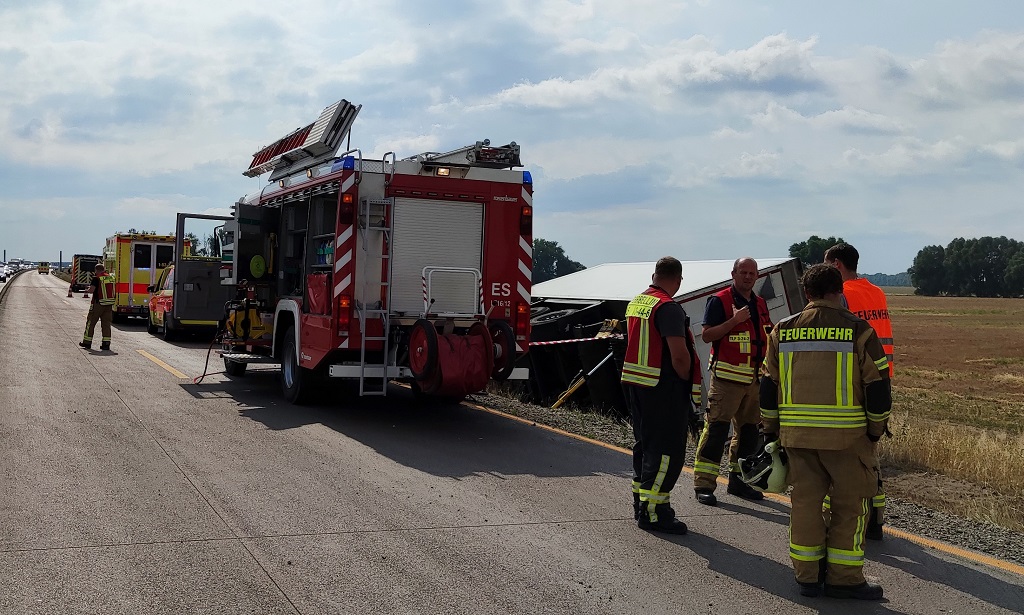Ostprignitz-Ruppin – Glück im Unglück hatten heute Morgen die Insassen von zwei Fahrzeugen als es zu einem heftigen Crash auf der A24 bei Linumer Bruch gekommen. Ein PKW VW befand sich vorschriftsmäßig im Überholvorgang als plötzlich der Lastwagen mit Anhänger auf die links Fahrspur kam. Der Kleinwagen wurde dabei gegen die Begrenzungsplanke gedrückt, anschließend schob der LKW den VW etwa 50 Meter vor sich hin, dabei wurde auch die rechte Seitenschutzplanke beschädigt, beide Unfallfahrzeuge kamen dann im Straßengarben zum Stehen, der Anhänger kippte um, der LKW befand sich in Schräglage. Polizei, Feuerwehr, mehrere Rettungsfahrzeuge kamen zum Einsatz.