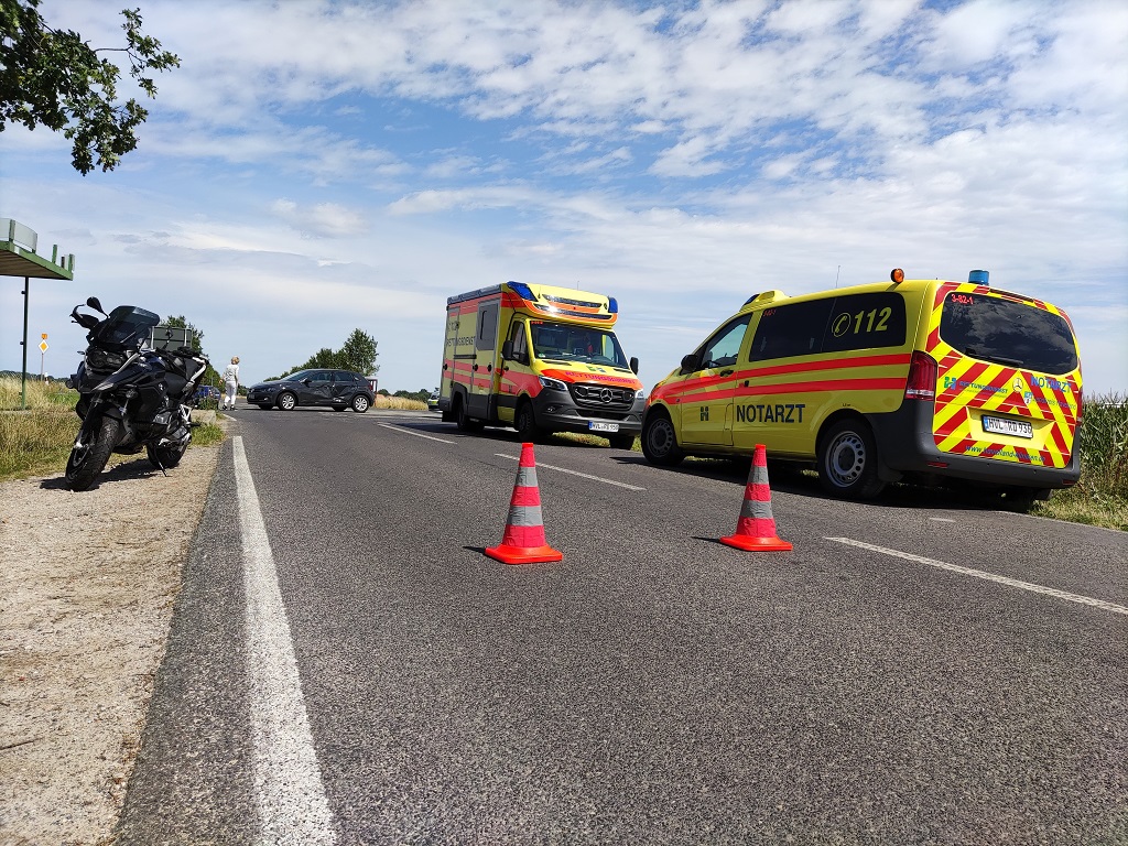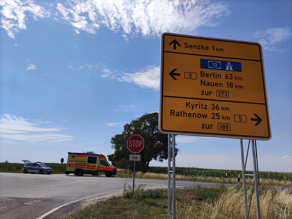 Havelland – Amt Friesack – Gemeinde Mühlenberge – Polizei- und Rettungseinsatz bei Unfall auf der B5/Kreisstraße 6313 in der Gemeinde Mühlenberge. Aus bislang noch nicht geklärter Ursache waren heute Nachmittag ab Abzweig Mühlenberge-Senzke ein PKW Polo und ein Motorrad BMW