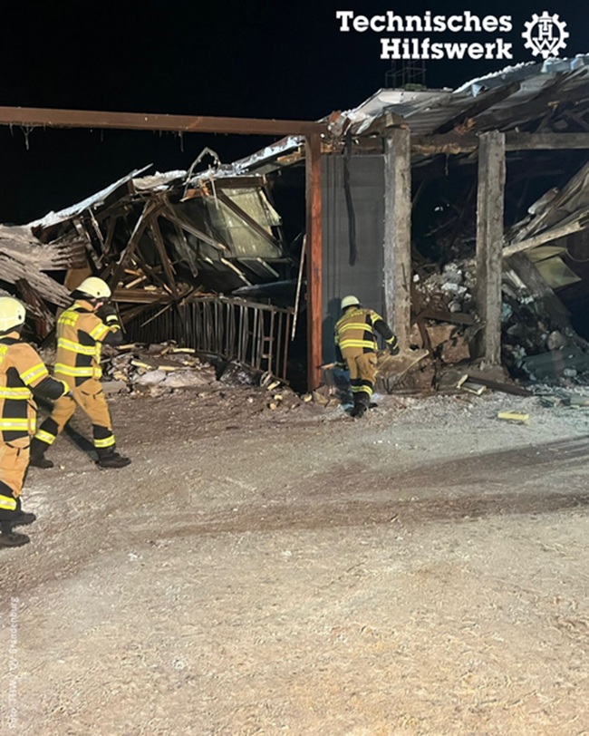 Potsdam-Mittelmark – in der Nacht zum Montag wurde der Ortsverband des THW Stadt Brandenburg nach Grubo (Wiesenburg/Mark) alarmiert, wo das Dach eines Rinderstalls eingestürzt war. Vor Ort zeigte sich nach der Erkundung, dass der Stall unterkellert ist. Da ein Radlader für die Statik über der Grube zu schwer war, konnten nicht direkt in das Gebäude hineingefahren werden. Die Rettung erfolgte stattdessen durch den Einsatz kleinerer Maschinen von Privatfirmen sowie durch viel Handarbeit der Feuerwehr und des technischen Hilfswerkes.
