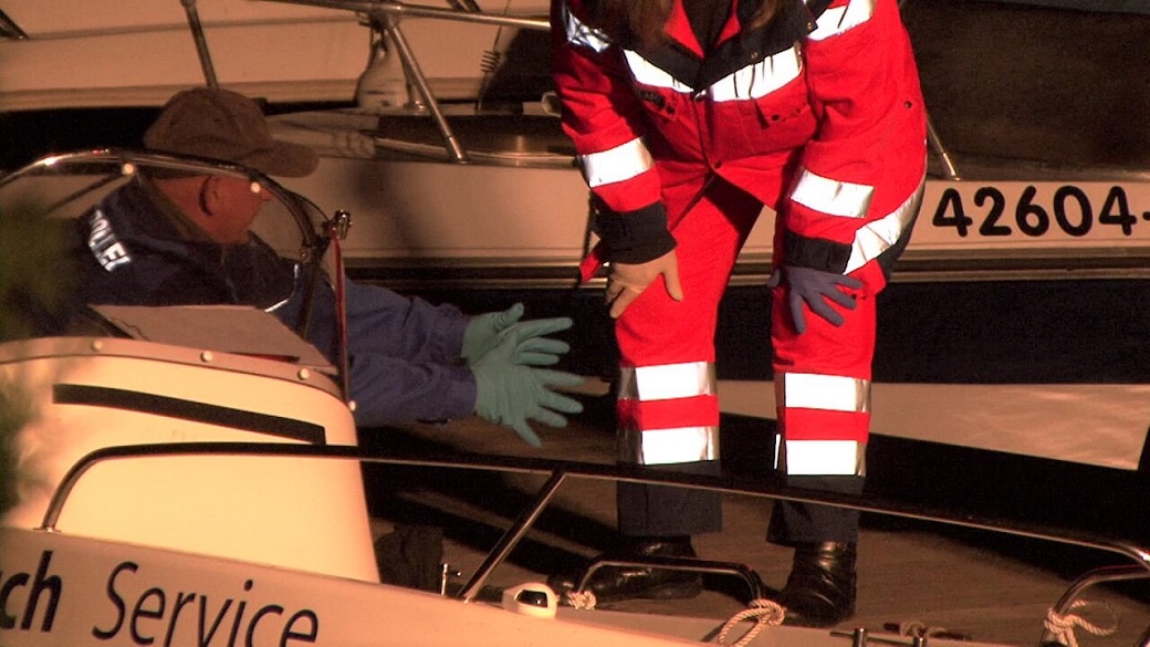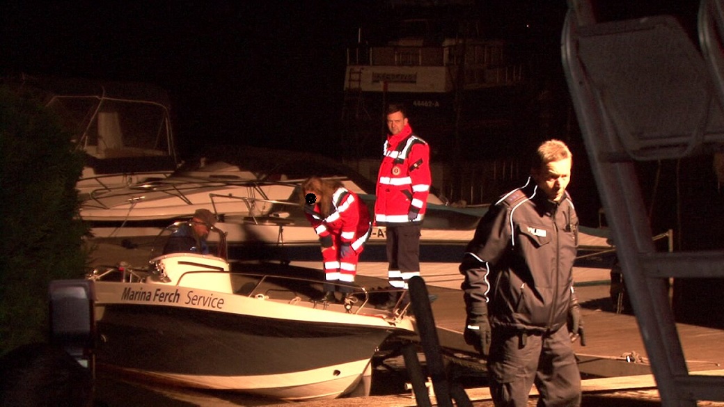 Rettungskräfte und Polizei am Tatort Steg/Marina Ferch