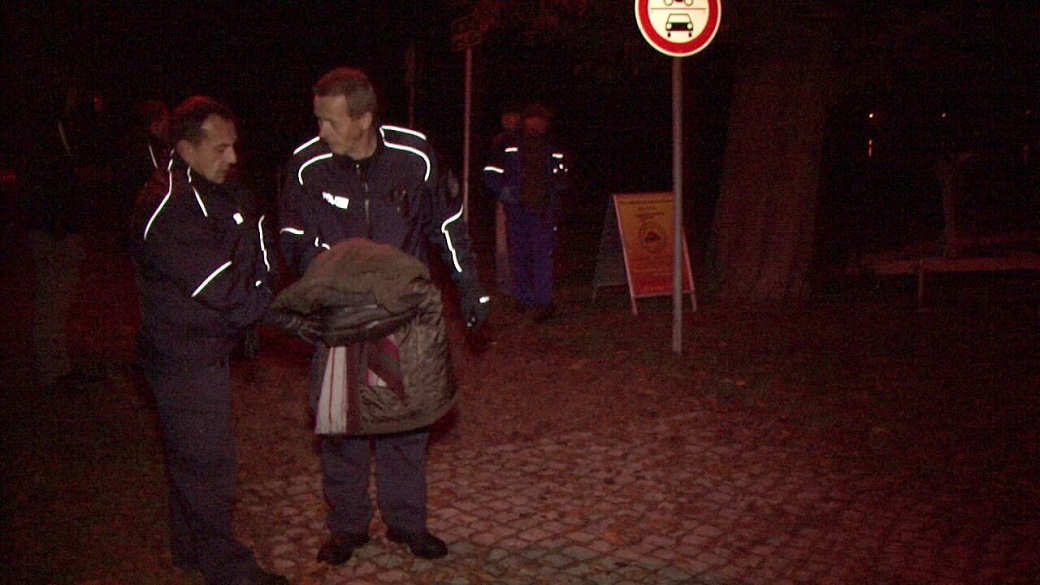 Schutzbeamte mit der Kleidung des Opfers nahe Tatort