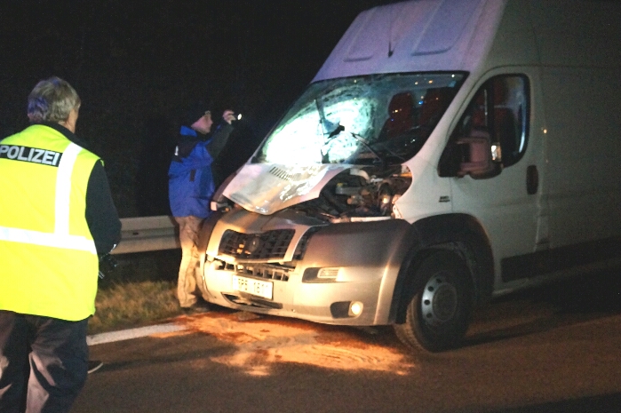 Nach vorläufigen Erkenntnissen wurde eine Person die sich auf die Autobahn 10 bei Leest herum taumelte von einem Transporter in Fahrtrichtung Dreieck Werder/Havel erfasst. Die unbekannte Person prallte in der Folge gegen die Frontscheibe des Fahrzeug. Rettungskräfte konnten für den Fußgänger nichts mehr tun, er erlag noch am Ort seinen Verletzungen. Die A 10 wurde ab Leest in Fahrtrichtung Dreieck Werder komplett gesperrt. Um den Unfallhergang genauer rekonstruieren zu können wurde ein Gutachter angefordert, der auch zeitnahe am Ereignisort eingetroffen ist. Mehr hierzu folgt..