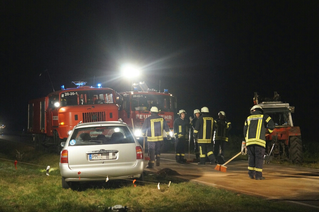 Hier war ein PKW Ford auf einen stehenden Traktor der am Fahrbahnrand stand aufgefahren. Nach Angaben der Polizei wurden die Insassen, ein älteres Ehepaar schwerverletzt. Feuerwehr, Rettungskräfte und Polizei kamen zum Einsatz. Die Kreisstraße bei Reetz musste bis zum Ende der Einsatzmaßnahmen komplett gesperrt werden.
