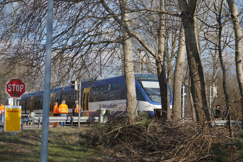 Erster Zug der NEB kann wieder Unfallstelle am Bahnübergang passieren.