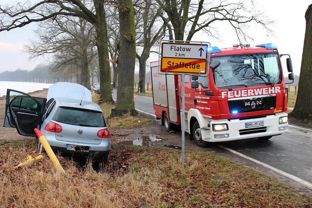 Kreis Oberhavel - Zu einem Unfall mindestens einer verletzten Person kam es am Sonntagnachmittag in Kremmen-Staffelde. Zwei PKW sind im Bereich Flatower/Staffelder Str. zusammengestoßen.