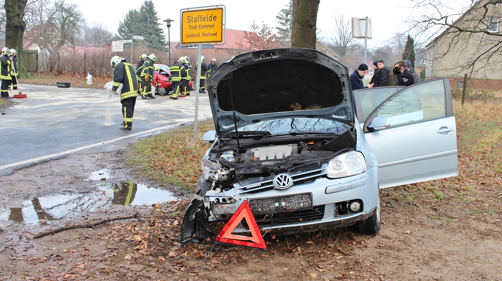 Der rote PKW hat hierbei den PKW VW Golf die Vorfahrt genommen. Zwei Rettungswagen, ein Noteinsatzwagen sowie die Feuerwehr der Stadt Kremmen, kamen zum Einsatz. Die Polizei war mit einem Funkstreifenwagen an der Unfallstelle und nahm den Unfall auf. Der Unfall passierte genau am Ortsausgang. Die Feuerwehr sperrte den Unfallort weiträumig ab.