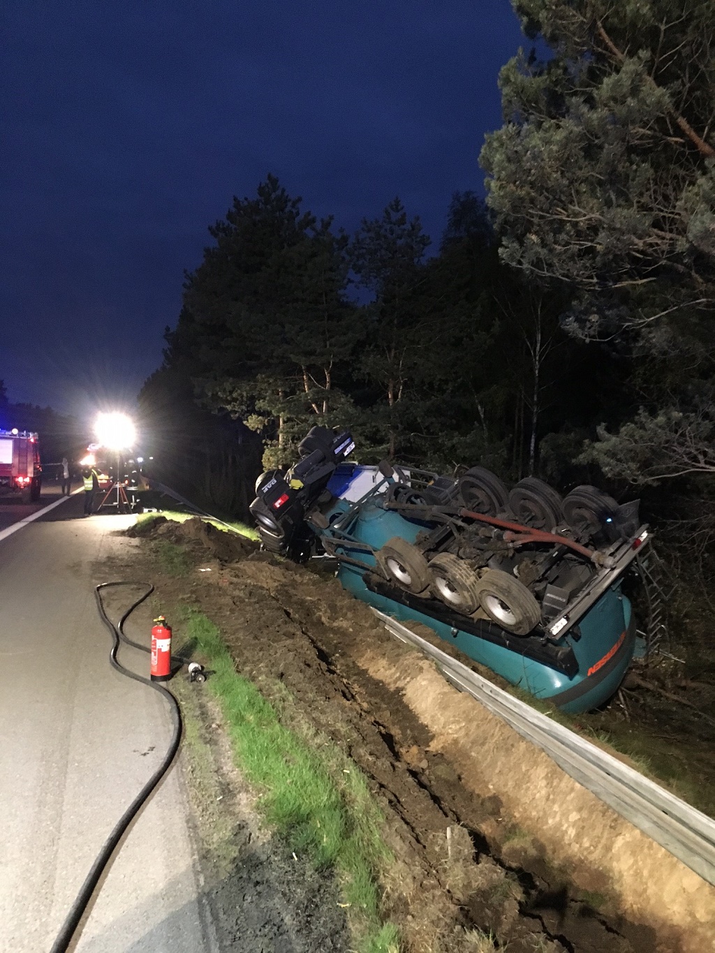 Nachtrag - Sattelzug überschlagen 21.04.2017 PD Nord Lkw im GrabenBirkenwerder – Aus bisher nicht geklärter Ursache verlor ein 40-jähriger Fahrzeugführer gestern Abend gegen 19.55 Uhr auf der Bundesautobahn 10 zwischen der Anschlussstelle Birkenwerder und dem Autobahnkreuz Oranienburg die Kontrolle über eine Sattelzugmaschine mit Auflieger (mit 25 Tonnen Zement beladen), touchierte zunächst die Mittelschutzplanke, kam nach rechts von der Fahrbahn ab und durchbrach nachfolgend die Schutzplanke der Richtungsfahrbahn.