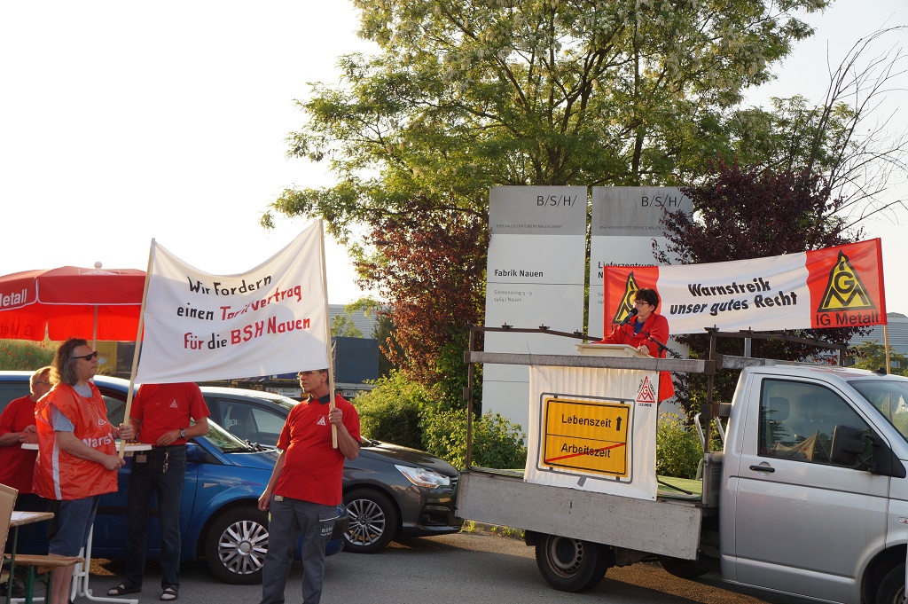 Die Zufahrtsstraße zum Gelände von Bosch-Siemens war dadurch blockiert, die Produktionsbänder standen wohl still wie eine Bevollmächtigte der IG Metall mitteilte. Eine mobile Bühne, laute Musik und Trillerpfeife sorgte bei der BSH Nauen für große Aufmerksamkeit.