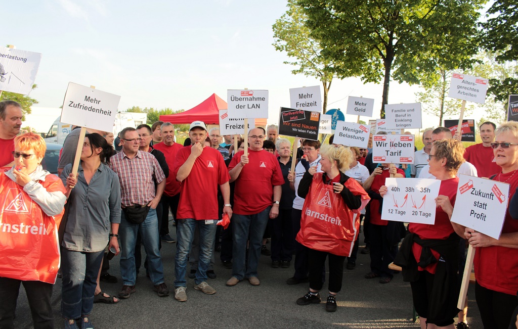 Die große Zahl an streikenden Mitarbeitern die mit ihrer Gewerkschaft IG Metall vor einer Werkszufahrt, mit Transparenten, Plakaten,Trillerpfeifen und einer Pappkartonmauer mit Forderungen auf ihre miserable Situation hinwiesen wurden unterstützt von Kollegen des Deutschen Gewerkschaftsbund (DGB), der IG Metall Bildungsstätte sowie von Mitarbeitern verschiedener Fertigungsbetriebe aus der Region wie ALU Druckguss Brieselang, Malo in Wustermark und den ZF Betrieben Brandenburg (Havel). Zum Teil werden einfach die Arbeitszeiten hochgeschraubt, wenn mehr Aufträge angenommen wurden als mit den Mitarbeitern zu schaffen ist, auch müssen die Feiertage raus gearbeitet bzw. nachgearbeitet werden, teilte die Beschäftigten mit.