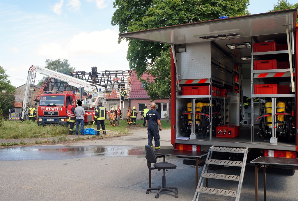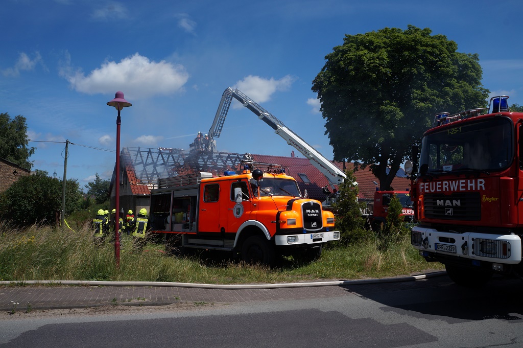 Update: 21.34 Uhr/OPR - Zu einem Brandausbruch kam es heute Mittag in einem Dachstuhl in einem Wohnhaus im OT Kränzlin. Drei Personen erlitten dabei Verletzungen und kam in eine Klinik. Die Feuerwehren kamen mit 25 Fahrzeugen und über 80 Kräften zum Löscheinsatz.