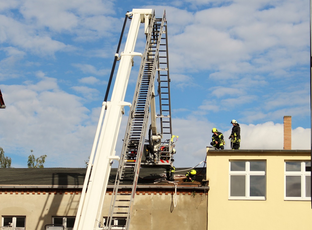 Landkreis Havelland - Kurzmeldung - Zu einem größeren Einsatz der Feuerwehren der Stadt Rathenow mit Ortsteile kam es heute Nachmittag in der Buschstraße. Nach Angaben der Feuerwehr war bei Dacharbeiten an einem Gebäude ein Feuer ausgebrochen. Die Feuerwehr rückte mit etwa 40 Kräften mehreren Fahrzeugen darunter zwei Drehleiterwagen an.