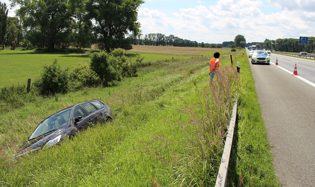Kurzmeldung - Gem. Fehrbellin - Frau verunglückt mit PKW auf der Bundesautobahn 24 zwischen den Anschlussstellen Fehrbellin und Neuruppin-Süd in Fahrtrichtung Hamburg. Das Auto kam aus noch ungeklärter Ursache nach rechts von der Fahrbahn ab und im Böschungsgraben zum Stillstand. Es kam auf Grund des Unfalls nur zu geringen Verkehrsbehinderungen.
