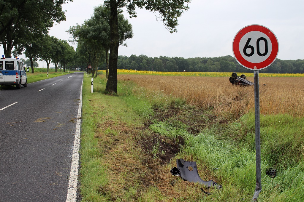 Gem. Mühlenberge - Ein weiterer Unfall war auf einer Kreisstraße zwischen den Gemeinden Paulinenaue und Mühlenberge zu beklagen, hier kam aus ungeklärter Ursache ein PKW Ford nach rechts von der Straße ab und überschlug sich anschließend auf dem Getreidefeld und blieb auf dem Dach liegen. Ob der Fahrzeugführer Verletzungen davon trug ist bislang unbekannt.