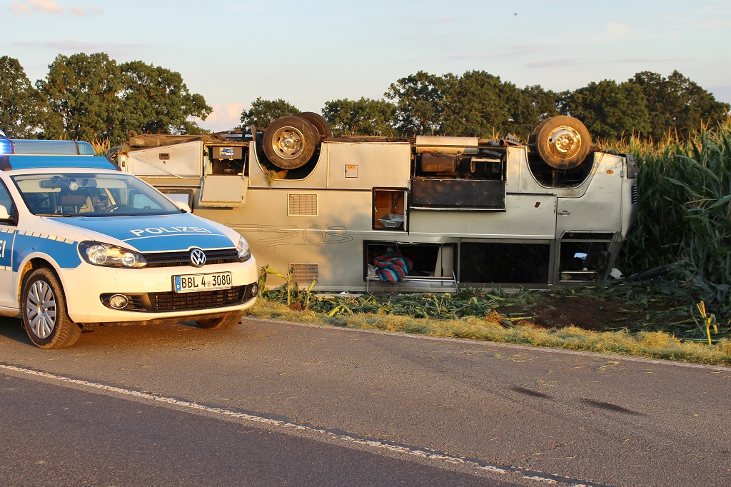 OPR - Kurzmeldung - Video - Am Montagabend kam es auf der L 165 in der Gem. Fehrbellin (Ostprignitz-Ruppin) zu einem Unfall mit einem Wohnmobil, zwei Personen erlitten dabei Verletzungen. Das Fahrzeug kam nach links in den Grünstreifen und anschließend nach rechts von der Fahrbahn ab bis das Reisemobil sich im Maisfeld überschlug und auf dem Dach zum liegen kam.