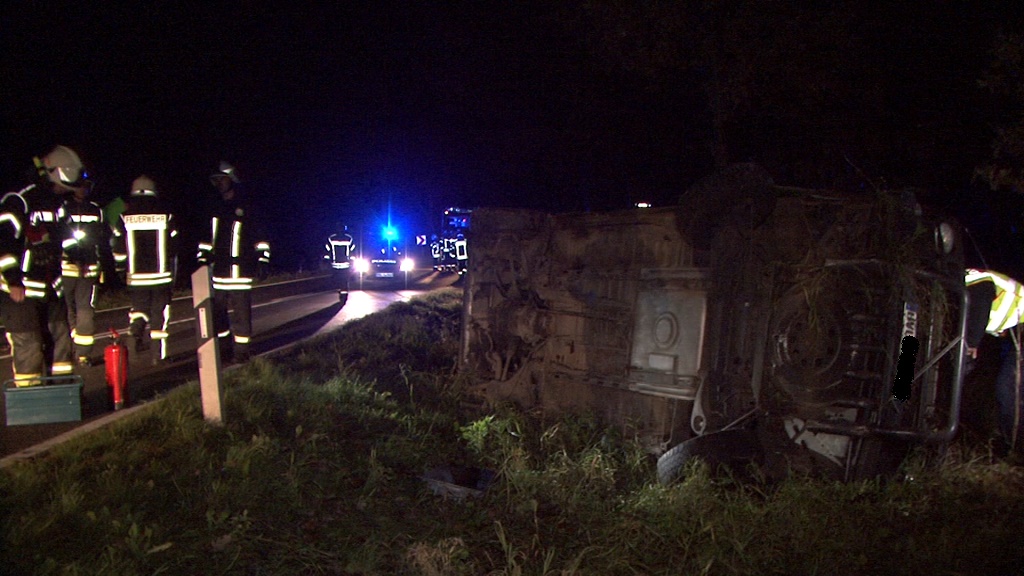 Nach bisherigen Erkenntnissen kam der Fahrer (Mitte 30) eines Kleintransporter aus noch unbekannter Ursache in Fahrtrichtung Priort nach rechts von der Fahrbahn ab kam dann nach links auf die Gegenfahrbahn durchfuhr die Straßen bashung ist das Auto auf die Fahrerseite zum Liegen kam. Nach Polizeiangaben am Unfallort wurde an der Unfallstelle Alkoholgeruch wahrgenommen, im Kleintransporter VW selbst befanden sich auch diverse Bierflaschen die zum Teil bereits zerbrochen waren. Rettungskräfte brachten den Fahrer in ein Krankenhaus wo auch eine Blutentnahme durchgeführt werden soll.