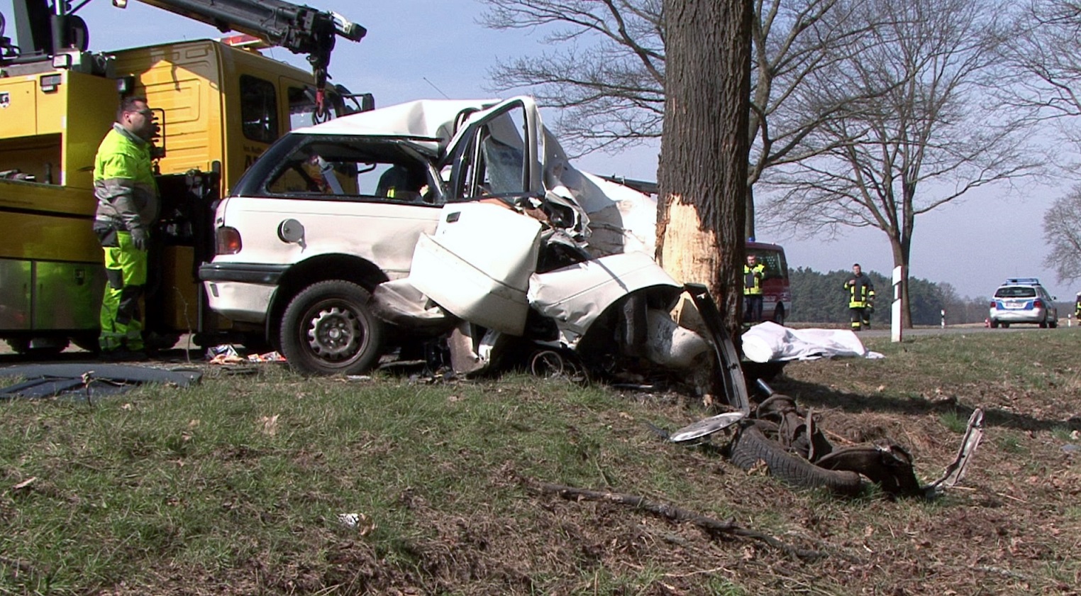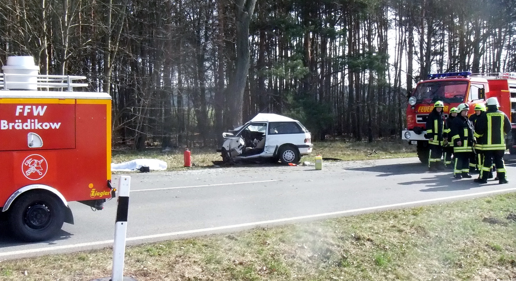 Einsatzkräfte der Polizei und Feuerwehr sicherten Die Unfallstelle ab. Der PKW mit alt bekannten Nauener Nummernschild kam aus Richtung Kreisverkehr B5/B188 nach rechts von der Straße ab und kollidierte anschließend mit einen Baum. Der Aufprall war dabei so heftig das sich die Front der PKW regelrecht um den Straßenbaum wickelte. Rettungskräfte mit Unterstützung eines Hubschraubers versuchten wohl noch das Leben des Verunglückten zu retten, der 92-jährige erlag noch an der Unfallstelle seinen Verletzungen. Der Kriminaldauerdienst kam zum Ereignisort um zusammen mit der Schutzpolizei den genauen Unfallhergang zu ermitteln (Q: Polizei am Ort, Medien). Mehr hierzu folgt..
