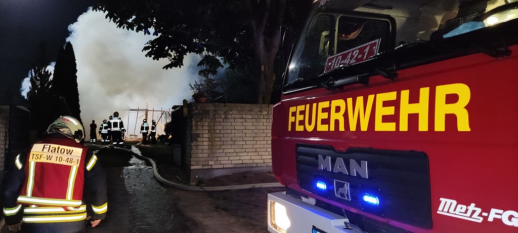 Oberhavel - aus bislang noch ungeklärter Ursache kam es am frühen Dienstagmorgen im Ortsteil Flatow zu einem Brandausbruch auf einem Grundstück. Das massive Scheunengebäude von einem Umfang etwa 20x10 Meter brannte trotz schnellen Eingreifen der Feuerwehr Kremmen bis auf die Grundmauern nieder. Die Feuerwehr war mit rund 50 Kräfte und drei Löschzügen im Einsatz. Bis etwa 6.00 Uhr werden die Löschmaßnahmen am Brandort noch andauern. Zur genauen Brandursache ist bislang noch nichts weiter.