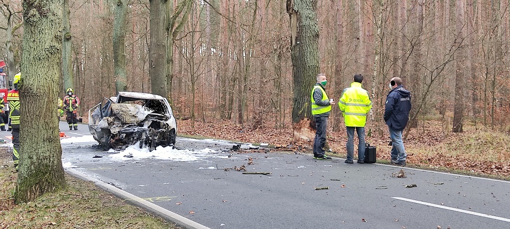 Erstmeldung: Aus bislang noch ungeklärter Ursache ist heute Mittag ein PKW zwischen den Ortsverbindungen Sommerswalde und Germendorf von der Straße abgekommen und prallte anschließend gegen einen Baum. Die Kollision war so heftig das sich Fahrzeugteile bis in den Wald hinein verteilten, der Unfallwagen selbst ging dann in Flammen auf. Die Feuerwehr musste schweres Gerät einsetzen um die unbekannte Person aus dem völlig verbrannten PKW bergen zu können. Ein Gutachterteam kam zum Einsatz.