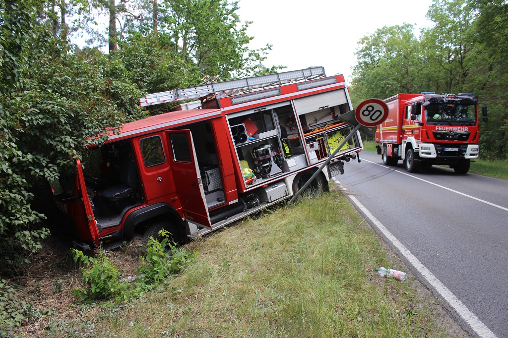 Landkreis Havelland, Landesstraße 201, zwischen Alt-Brieselang und dem Abzweig nach Brieselang - Unfall eines Feuerwehrfahrzeugs- Dienstag, 03. Juni 2019, 12:40 Uhr - Am Dienstagmittag kam ein Tanklöschfahrzeug der Feuerwehr auf der L201 von der Fahrbahn ab. Das Einsatzfahrzeug war zur Nachaufsicht und Brandbekämpfung in Richtung des Wald- und Heidebrandes vom Vortag an der A10 unterwegs. Bei der Fahrt mit Blaulicht überholte die Feuerwehr mehrere PKW, als plötzlich eine 69-Jährige mit ihrem Wagen zum Überholen ausscherte.