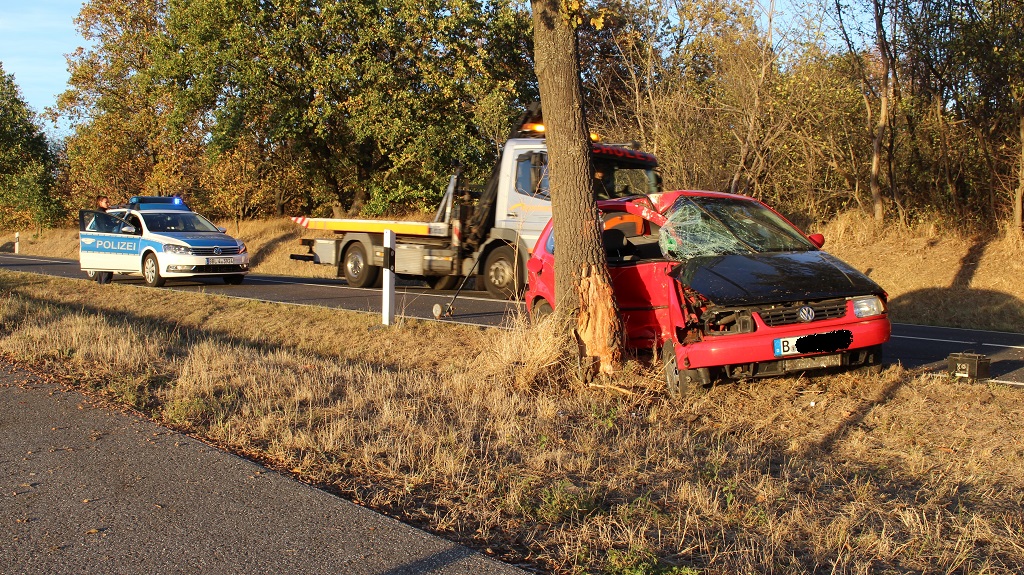 Havelland - zu einem Unfall mit zwei Verletzten kam es am späten Dienstagnachmittag auf der K 6304 in der Gem. Wustermark. Aus noch unbekannter Ursache war ein PKW mit Berliner Kennzeichen aus Richtung OT Priort kommend in Fahrtrichtung Elstal aus dem Kurvenbereich von der Fahrbahn abgekommen, drehte sich um die eigene Achse und prallte anschließend mit der Beifahrerseite gegen einen Baum. Polizei, Feuerwehr- und Rettungskräfte kamen zum Einsatz, auch ein Rettungshubschrauber kam zur Unterstützung. Beide männliche Insassen wurden verletzt und kamen ins Krankenhaus. Der PKW VW Polo wurde bei dem Crash völlig zerstört.