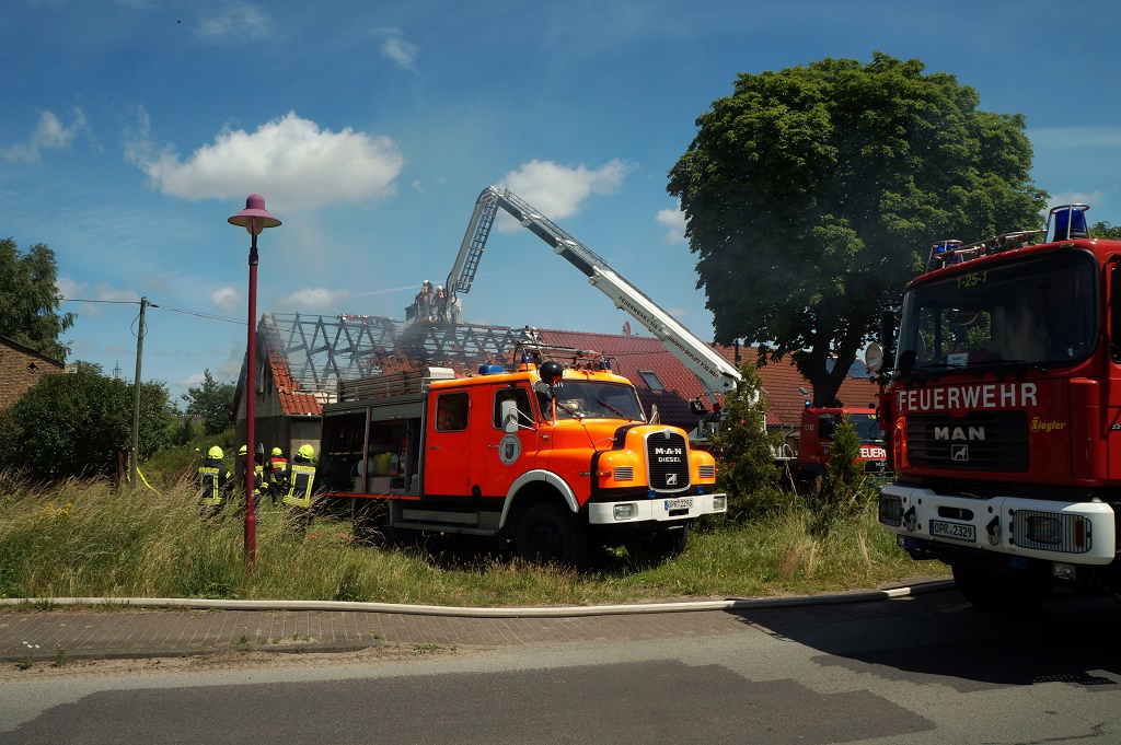Update: 21.34 Uhr/OPR - Zu einem Brandausbruch kam es heute Mittag in einem Dachstuhl in einem Wohnhaus im OT Kränzlin. Drei Personen erlitten dabei Verletzungen und kam in eine Klinik. Die Feuerwehren kamen mit 25 Fahrzeugen und über 80 Kräften zum Löscheinsatz.