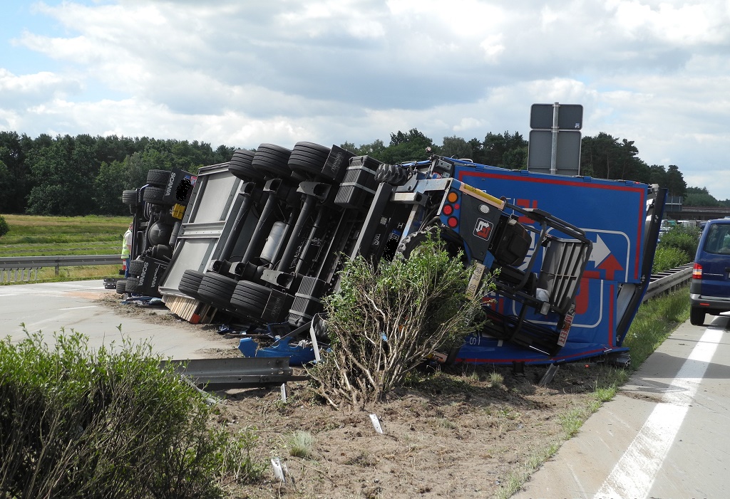 Oder-Spree/Frankfurt (Oder) A10 bei Freienbrink – Sattelzug umgekippt - Auf der A10 ereignete sich am 7.Juli, gegen 10 Uhr, ein schwerer Unfall. Der Fahrer eines Sattelzuges durchbrach aus bisher ungeklärter Ursache zwischen Anschlussstelle Freienbrink und Dreieck Spreeau die Mittelleitplanke und kippte mit dem Fahrzeug um.