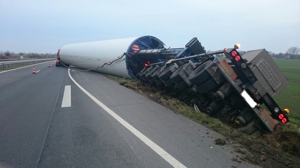 BAB 20 – Schwerlasttransport verunfallt Am 04.12.2015, gegen 01:40 Uhr, wurde die Polizei über den Unfall eines Schwerlasttransportes informiert. Der von einer dänischen Spezialfirma entsandte Transporter hatte Teile einer Windkraftanlage geladen und war in Fahrtrichtung Lübeck unterwegs gewesen.