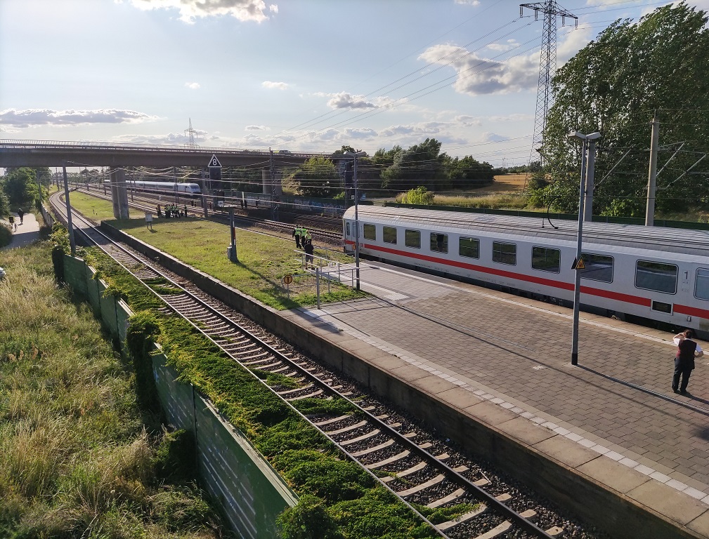 Havelland – Bundespolizei, Feuerwehr- und Rettungskräfte kamen heute Nachmittag wegen einer ICE-Panne auf der Bahnstrecke zwischen Elstal und Wustermark zum Einsatz. Rund 150 Fahrgäste mussten etwa 100 Meter vom Bahnhof Wustermark entfernt auf freier Strecke evakuiert werden. Der Strom war bei dem betroffenen Schnellzug, der wohl auf dem Weg nach Münster war, ausgefallen. Die Lok muss nun abgeschleppt werden. Es kam zuvor aber an der Bahnanlage unweit des Bahnhofs Elstal zu einem Böschungsbrand, dabei kam es zu Beschädigungen an der Oberleitung, vermutlich ist dabei auch der Stromabnehmer vom Intercity-Express beschädigt worden.