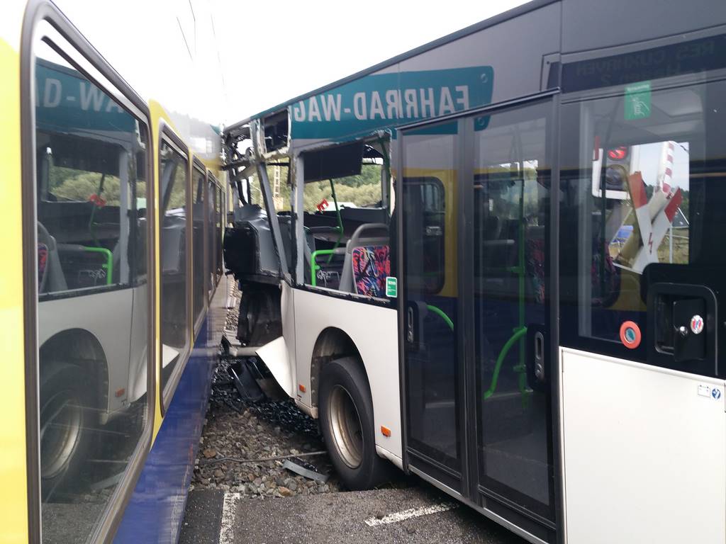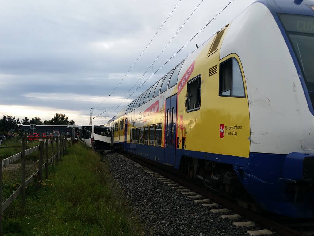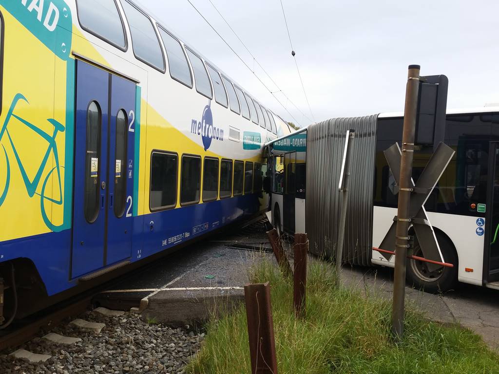 Nach bisherigen Ermittlungen knickte der Gelenkbus aufgrund der schmalen Straße derart ein, dass durch eine technische Vorrichtung das ganze Fahrzeug blockierte und der Motor sich abschaltete. Das Heck des Gelenkbusses stand dabei noch auf den Bahngleisen. Es war offensichtlich nicht mehr möglich, das Fahrzeug neu zu starten, um aus dem Gefahrenbereich zu kommen. Die Busfahrerin reagierte sofort und veranlasste die schnelle Räumung des Busses. Gleichzeitig versuchte sie noch Kontakt mit der Bahn aufzunehmen. Die Schüler hatten den Bus gerade verlassen und befanden sich auf der Umleitungsstrecke, als der Metronom aus Richtung Buxtehude herannahte. Trotz einer Notbremsung konnte ein heftiger Zusammenstoß nicht verhindert werden. Durch den Aufprall entstand ein Schaden von sicher über 300.000,-Euro. Nach bisherigen Erkenntnissen gibt es nur einen Leichtverletzten, der möglicherweise im Metronom gesessen hatte. Da zunächst der Umfang des Schadens bzw. die Anzahl der Verletzten nicht bekannt war, wurden mehrere Rettungswagen und Notärzte zur Unfallstelle entsandt. Außerdem waren die Feuerwehren aus Buxtehude und Hedendorf im Einsatz. Die Bahngleise werden für mehrere Stunden gesperrt bleiben, Schienenersatz ist eingerichtet.