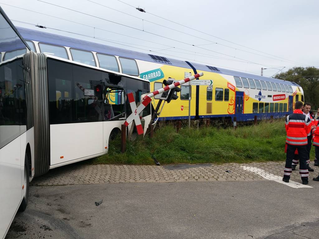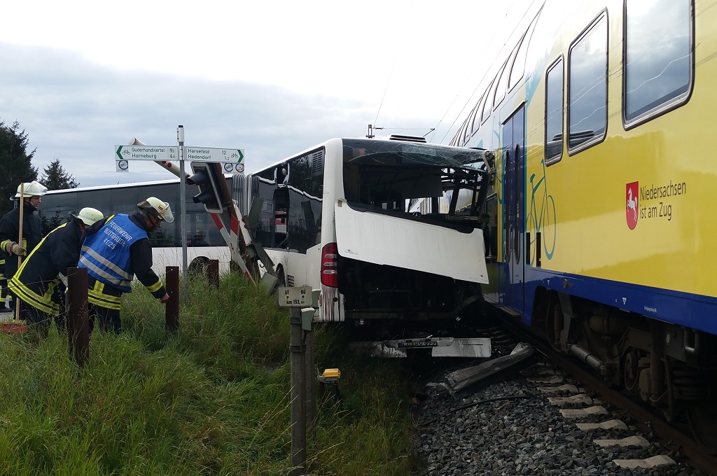 Niedersachsen - Stade (ots) - Zusammenstoß zwischen Metronom und Schulbus in Buxtehude-Hedendorf - Am Mittwoch, dem 16.09.2015, kurz nach 08:00 Uhr, befuhr eine 23-jährige Busfahrerin aus Jork mit einem Schulbus, der mit ca. 60 Schülern besetzt war, eine aufgrund von Straßenbauarbeiten eingerichtete Umleitungsstrecke in Buxtehude-Hedendorf und wollte nach Passieren der Bahnstrecke Buxtehude-Stade nach rechts in Richtung Buxtehude abbiegen.