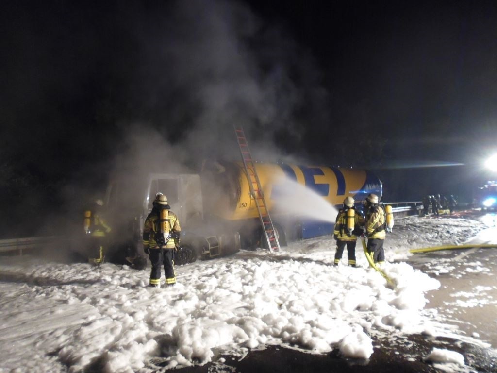 Nachdem ihm dies aber nicht gelang, entfernte er sich vom Fahrzeug und verständigte die Polizei. Nach jetzigen Erkenntnissen dürfte ein technischer Defekt im Bereich der Lüftung als Brandursache in Frage kommen. Ermittlungen dazu sind jedoch noch im Gange. Der Schaden am Lkw wird auf 100.000 Euro geschätzt. Verletzt wurde niemand. Der Lkw hatte insgesamt etwa 35.000 Liter Treibstoff geladen. Den insgesamt fünf eingesetzten Feuerwehren gelang es, ein Übergreifen des Feuers auf den Sattelauflieger zu verhindern. Im Einsatz waren insgesamt 27 Fahrzeuge der Feuerwehr mit 166 Mann. Die Polizei hatte mehrere Streifen vor Ort. Das DRK war ebenfalls präsent, musste jedoch zum Glück nicht eingreifen. Das Technische Hilfswerk (THW) übernahm die Stauabsicherung bis in die Morgenstunden. Bis 01.25 Uhr war die A 5 in beide Richtungen voll gesperrt. Die Sperrung in Richtung Basel (Süden) konnte aufgrund der Bergungs- und Reinigungsarbeiten erst gegen 06.15 Uhr aufgehoben werden. Stand: 09.50 Uhr - Erstmeldung von 02.51 Uhr - Am 18.07.2016, gg. 00.40 h, kurz nach der Aufffahrt auf die BAB 5 in Riegel in Fahrtrichtung Süden, bemerkte ein Tanklastfahrer Brandgeruch in der Fahrerkabine seines Tanklastzuges. Er hielt daraufhin an und verständigte Polizei und Feuerwehr. Der Brand setzte die gesamte Führerkabine in Brand. Die Feuerwehr konnte jedoch ein Übergreifen des Brandes auf die Ladung (Diesel und Benzin) verhindern und den Brand löschen. Wegen den Lösch- und Bergungsmaßnahmen musste die BAB 5 in beide Richtungen bis 01:25 Uhr gesperrt werden. Derzeit besteht nur noch eine Sperrung / Ausleitung in Richtung Süden ab der Autobahnanschlussstelle Riegel. Diese wird aufgrund der Bergungsmaßnahmen noch mindestens bis 07 Uhr bestehen bleiben. Es wird nachberichtet.