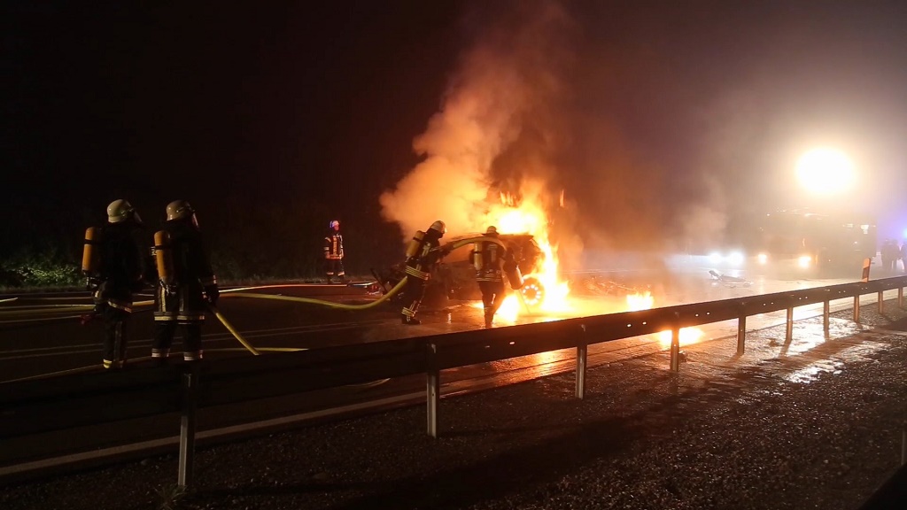 Video/Bayern - MARKTOBERDORF - Drei Tote nach schweren Verkehrsunfall - Beifahrer verbrennt im Fahrzeug - Fahrer wird von Ersthelfer aus dem Auto gezogen verstirbt auch Frontalzusammenstoß - Pkw geht in Flammen auf - Ein Verkehrsunfall mit 3 Toten, ereignete sich am Sa., 08.10.2016, gegen 23.50 Uhr auf der B12 im Bereich der Anschlussstelle Marktoberdorf/Geisenried. Zur Unfallzeit befuhr ein 32-jähriger Ostallgäuer mit seinem PKW die B12 von Kempten kommend in Richtung Kaufbeuren.