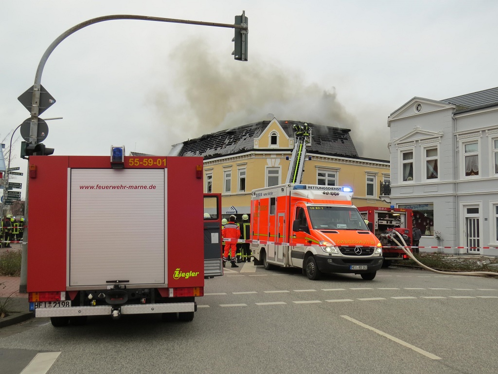 Schleswig-Holstein - Marne (ots) - 200 Einsatzkräfte bei Brand eines Wohn- und Geschäftshauses - Heute Morgen kam es gegen 9.45 Uhr aus bisher ungeklärter Ursache zu einem Feuer in einem mehrstöckigen kombinierten Wohn- und Geschäftsgebäude in der Marner Innenstadt.