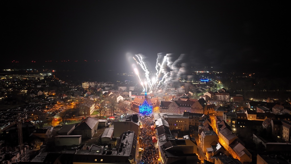 Landkreis Havelland - Nauen, 22.12.2025/ Das Nauener Rathausleuchten 2026 bietet den Besucherinnen und Besuchern eine Kombination aus Lichtinstallationen, Musik, Laser-Effekten und Feuerwerk.