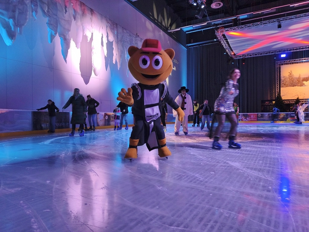 Seit heute am Nicolaus (06.12.2025) wieder möglich, der Freizeitspaß in der Eventhalle am Filmpark Babelsberg – das Filmpark-Maskottchen FLIMMY hat sich dazu am Eröffnungstag auf der Eisbahn den ersten Besuchern gleich gewidmet. Die glitzernde Eiswelt mit ca. 650 qm Fläche ist gerade bei der kalten Jahreszeit eine willkommene Abwechselung in der Metropolis Halle, da der Filmpark Babelsberg wie üblich mit seinen Hauptattraktionen in der Winterpause ist. Kleine und große Schlittschuhläufer sind hier bis Mitte Februar 2026 zum Spaß auf Kufen herzlich willkommen. Werktags können Gruppen und Schulklassen bereits ab 10:00 Uhr nach Voranmeldung eislaufen. Ab 12:30 Uhr ist dann für jeden geöffnet.