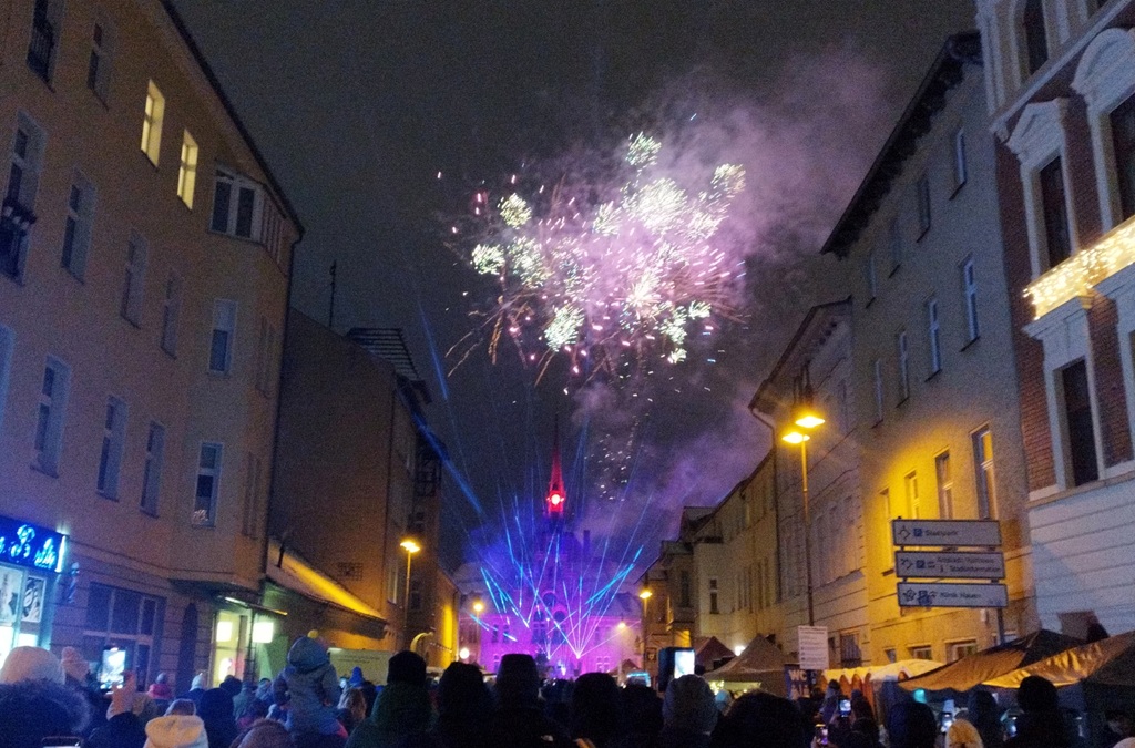 Nachtrag der Stadt Nauen zur Bilanz - Auch die zweite Auflage des „Nauener Rathausleuchten“ verlief am 3. Januar planmäßig. Schneeschauer, rutschige Straßen und Temperaturen knapp unter dem Gefrierpunkt waren für Tausende Besucherinnen und Besucher kein Hindernis, dem Spektakel rund ums Rathaus fernzubleiben. Bereits ab 15 Uhr konnte sich das Publikum beim bunten Programm vor dem Rathaus und reichlicher Kulinarik auf der angrenzenden Berliner Straße die Zeit verkürzen, bevor gegen 18:30 Uhr der Nauener Veranstalter Tobias Brudlo mit seinen vielen Unterstützern den roten Knopf für das eigentliche Spektakel drückte. Schillernde Laser-Effekte mit prächtigem Feuerwerk, untermalt von wummernden Techno-Beats: Das sind die Markenzeichen des „Rathausleuchtens“, das Tobias Brudlo zur festen Marke zum Jahresbeginn machen möchte.