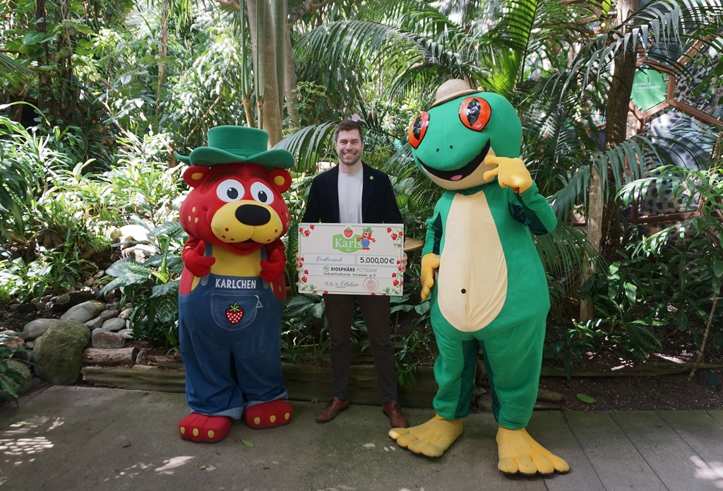Karls Erlebnis-Dorf unterstützt Zukunftsforum Potsdam e. V. mit 5.000 Euro - Tropische Vögel, exotische Echsen und quirlige Affen kennen die Besucher*innen der Biosphäre Potsdam. Doch heute konnte man einen ganz besonderen tierischen Gast in der Potsdamer Naturerlebniswelt entdecken: Karlchen, der Erdbär von Karls Erlebnis-Dorf. Er hatte die Ehre, einen Spendenscheck in Höhe von 5.000 Euro an Josch den Frosch, das Maskottchen der Biosphäre Potsdam, sowie an Nico Franzen, 2. Vorsitzender des Zukunftsforums Potsdam e. V., zu übergeben.
