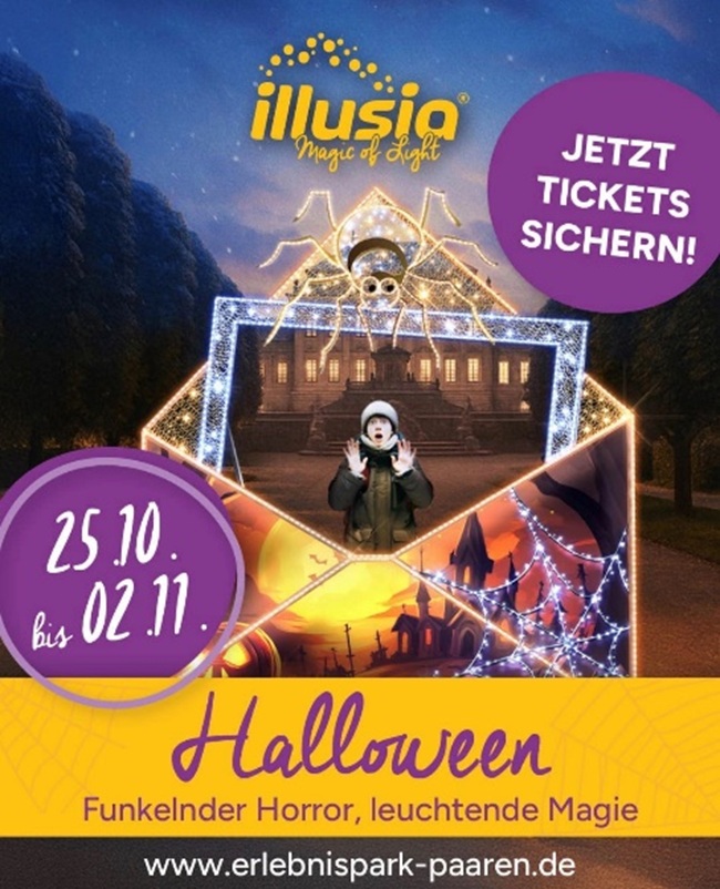 Havelland - Gemeinde Schönwalde-Glien - Paaren im Glien: Vom 25. Oktober bis zum 02. November 2025 wird der Park täglich von 16 bis 20 Uhr in gruselig schöner Leuchtkraft gestaltet. Eintauchen in mystische Atmosphären, wo euch magische Kreaturen und märchenhafte Lichter in ihren Bann ziehen. Illusia erhellt mit leuchtenden Figuren aus funkelnden Lichterketten die Wege und lädt euch zu einem unvergesslichen Abenteuer ein.